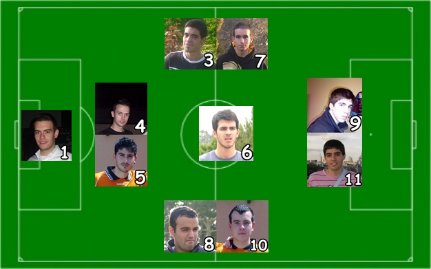 Aqui os dejo un esquema con numeros y fotos de cada jugador y su colocacion en el campo, que no es para nada definitiva porque a lo largo de la liga esto puede cambiar segun sea conveniente.